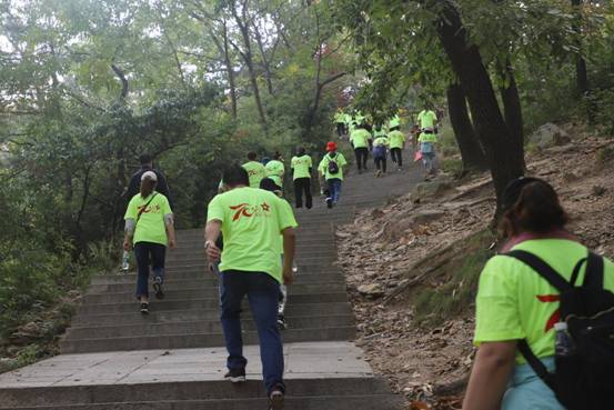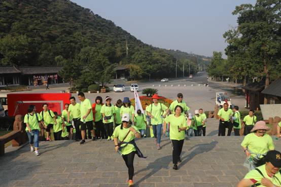 途中,大家興高采烈,談笑風(fēng)生,時而你追我趕、奮力攀爬,時而互相鼓勵、攜手并進,整個登山過程洋溢著溫馨、愉悅的氛圍,大家享受著登山的樂趣,向終點進發(fā)。從花果山山門到九龍橋,最考驗大家體力的是十八盤,十八盤位于花果山腰部的竹節(jié)嶺上,349級石階層層相迭,巧相搭構(gòu),通向嶺端,隨著高度的不斷攀升,加之蜿蜒崎嶇的山路起伏跌宕,不少職工累的氣喘吁吁,大汗淋漓,但是大家仍然興致盎然,朝著目標(biāo),不停地向上攀登。