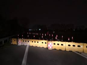 28日零點(diǎn)根據(jù)業(yè)主緊急通知,對(duì)宋跳及灌云西收費(fèi)站進(jìn)行封閉作業(yè)。公司緊急調(diào)配攔路水馬26個(gè),錐桶80個(gè),太陽(yáng)能閃光箭頭指示燈3臺(tái)。出動(dòng)工具車3臺(tái),人工7人。分成2個(gè)施工班組,及時(shí)封閉宋跳及灌云西收費(fèi)站3條出口匝道。
