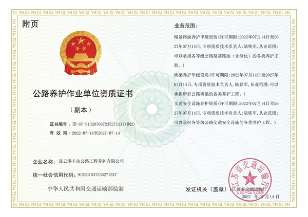 本次新取得的三項(xiàng)資質(zhì)證書,為豐達(dá)公司繼續(xù)立足公路養(yǎng)護(hù)市場奠定基礎(chǔ),也意味著可以拓展更加廣闊的公路養(yǎng)護(hù)市場領(lǐng)域。