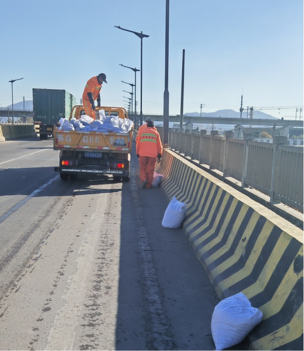 公司進(jìn)一步完善了除雪防滑保暢預(yù)案,結(jié)合實(shí)際開(kāi)展了除雪防滑應(yīng)急演練。對(duì)除雪機(jī)械設(shè)備進(jìn)行了全面系統(tǒng)的保養(yǎng)和維護(hù),儲(chǔ)備了融雪劑700余噸、防滑混合料300余噸,并在沿線橋梁、匝道、急轉(zhuǎn)彎等易滑易結(jié)冰路段放置了防滑砂和石子等混合料。同時(shí),安排專人時(shí)刻關(guān)注氣象變化,及時(shí)掌握氣象信息,一旦出現(xiàn)降雪天氣,隨時(shí)出動(dòng)人員和設(shè)備清障除雪。