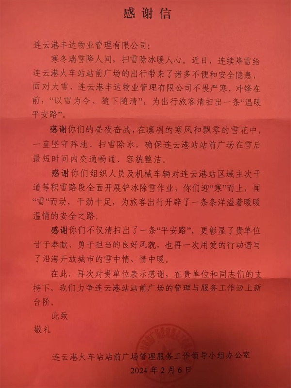 趙潔對(duì)市城管局、市廣場(chǎng)辦一直以來(lái)關(guān)心、支持表示感謝,同時(shí)他表示一面錦旗,是一份榮譽(yù),更是一份責(zé)任。這面錦旗既是對(duì)豐達(dá)公司工作的支持,同時(shí)也是對(duì)公司未來(lái)工作的鞭策。下一步,豐達(dá)公司將“錦”記于心,砥礪前行,以這次掃雪除冰工作為契機(jī),復(fù)盤推演查找不足,進(jìn)一步完善公司搶險(xiǎn)工作流程,切實(shí)做好綜合客運(yùn)樞紐的服務(wù)保障、環(huán)境衛(wèi)生等工作,保障綜合客運(yùn)樞紐周邊道路的暢通及旅客的出行安全。