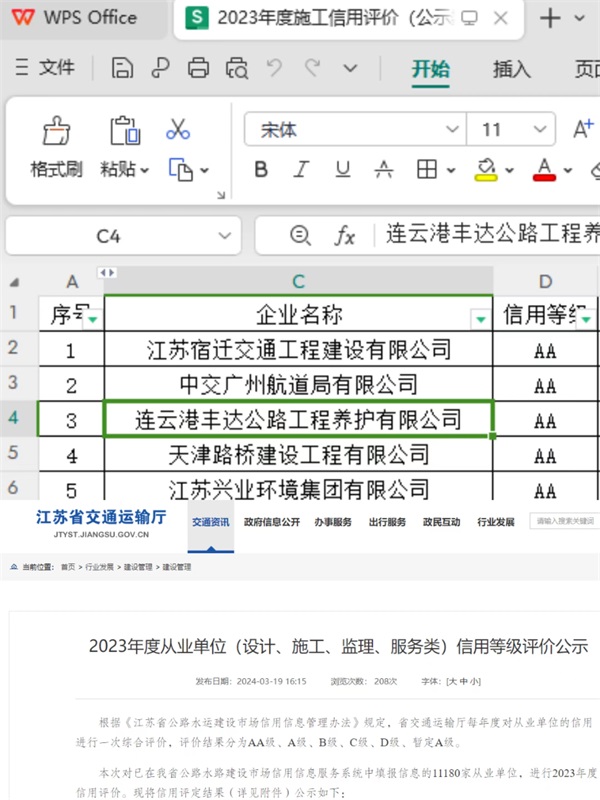 近日,江蘇省交通運(yùn)輸廳建設(shè)管理處公布了2023年度從業(yè)單位(設(shè)計(jì)、施工、監(jiān)理、服務(wù)類)信用等級(jí)評(píng)價(jià)結(jié)果,豐達(dá)公司首次榮獲年度施工信用評(píng)價(jià)AA級(jí)。