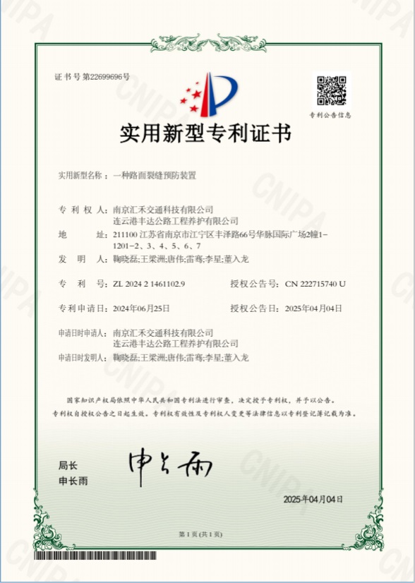 近日,豐達(dá)公司申報(bào)的實(shí)用新型專(zhuān)利《一種路面裂縫預(yù)防裝置》,經(jīng)國(guó)家知識(shí)產(chǎn)權(quán)局受理審核,成功獲得實(shí)用新型專(zhuān)利證書(shū)。