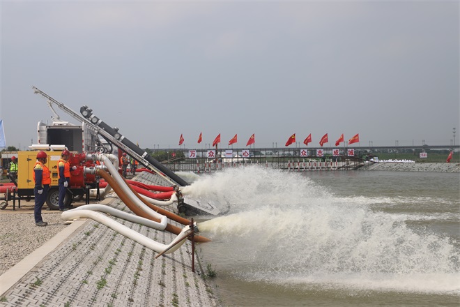 此次全市防汛搶險(xiǎn)綜合演練設(shè)置臺(tái)風(fēng)、城市特大暴雨、堤防險(xiǎn)情、人員落水四個(gè)搶險(xiǎn)救援背景并按照預(yù)警響應(yīng)、隊(duì)伍集結(jié)、險(xiǎn)情處置等環(huán)節(jié)有序開(kāi)展,豐達(dá)公司主要演練科目為“城市特大暴雨——城市內(nèi)澇處置”,利用垂直供排水搶險(xiǎn)車、及字母式大流量排水車進(jìn)行機(jī)泵排澇。