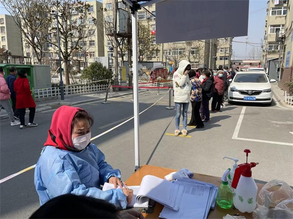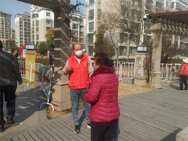 黨員董入龍?jiān)诤优匣ǔ切^(qū)配合社區(qū)做好維持核酸檢測(cè)隊(duì)伍秩序、查驗(yàn)蘇康碼等志愿服務(wù)活動(dòng)
