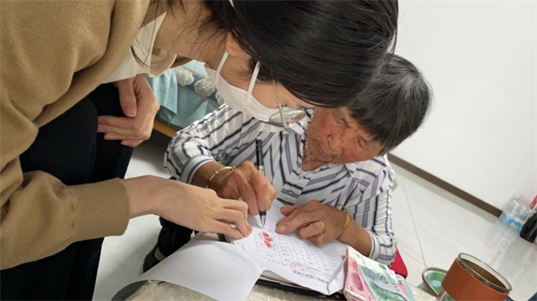 財務(wù)工作人員為老人辦理發(fā)放工資相關(guān)手續(xù)