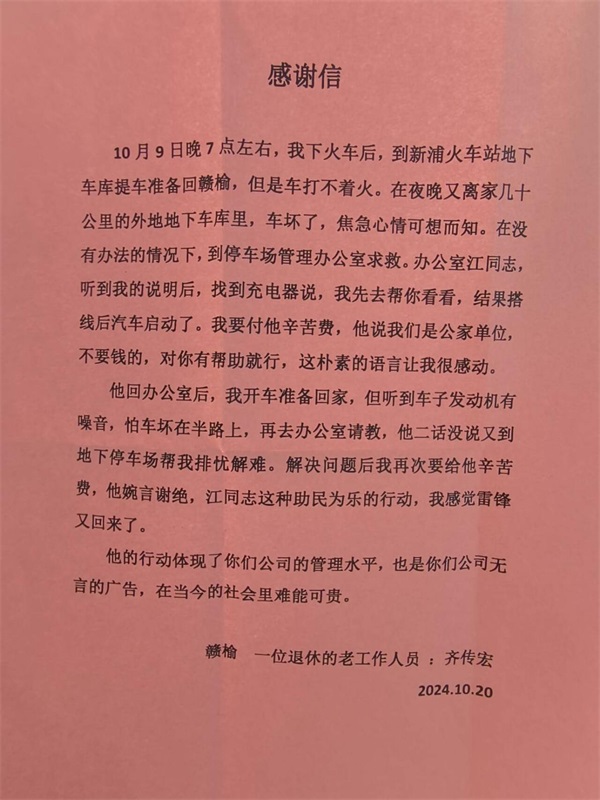 在10月9日晚7點(diǎn)左右,齊先生到綜合客運(yùn)樞紐地下停車(chē)場(chǎng)提車(chē)準(zhǔn)備回贛榆,但車(chē)打不著火,向停車(chē)場(chǎng)管理辦公室求救,公司職工江波立即伸出援手,不但幫助齊先生車(chē)子發(fā)動(dòng)成功,還幫助解決了車(chē)子其他問(wèn)題,他不求回報(bào)的熱心舉動(dòng)溫暖了齊先生的回家之路。