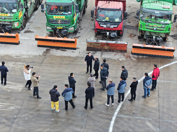 毛善通實(shí)地查看基地掃雪除冰設(shè)備、融雪劑存儲(chǔ)等情況,詳細(xì)詢問了車輛人員配備,路線定員及后勤保障措施,并現(xiàn)場(chǎng)聽取了王梁洲關(guān)于2025年掃雪除冰準(zhǔn)備工作相關(guān)匯報(bào)。