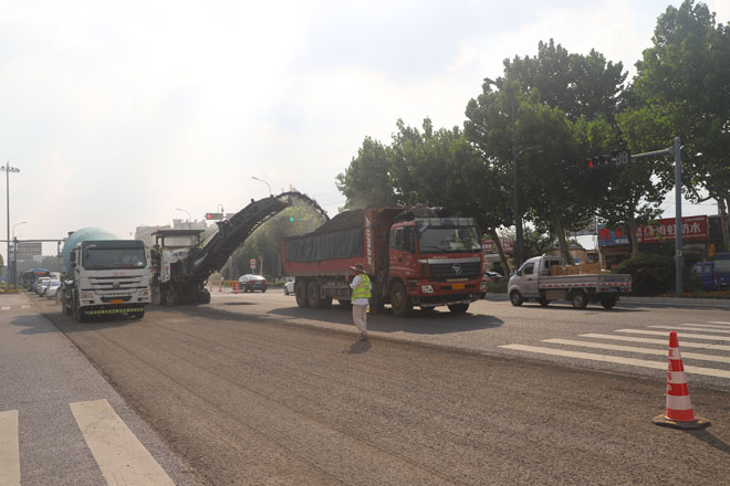 人民路外圍車流量大,重型車輛較多,路面沉降、龜裂、車轍等病害較為嚴重,行車舒適性較差,且不能全封閉施工。為加快施工進度,避免高峰路段擁堵,項目部人員不畏高溫酷暑,攻堅克難,采取降塵除塵、分段施工、基坑防護等多項措施錯峰施工,克服噪音擾民等諸多困難,做好全線文明施工工作,共投入機械設備18余臺次,人員30余人,歷經八晝夜的加緊施工,共修補攤鋪路面56336.7平方米。